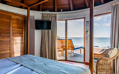 Bungalowene er på ca. 20m² utstyrt med dobbeltseng, bad med dusj, WC, AC, TV, telefon, safe, et lite kjøleskap og hårføner.