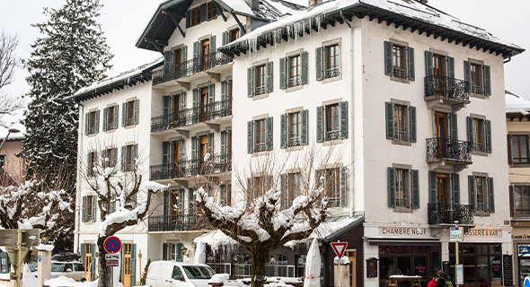Här bor du med närhet till flygplatsen, egen skidhyra på hotellet och ett centralt läge. Fin utsikt över Mont Blanc.